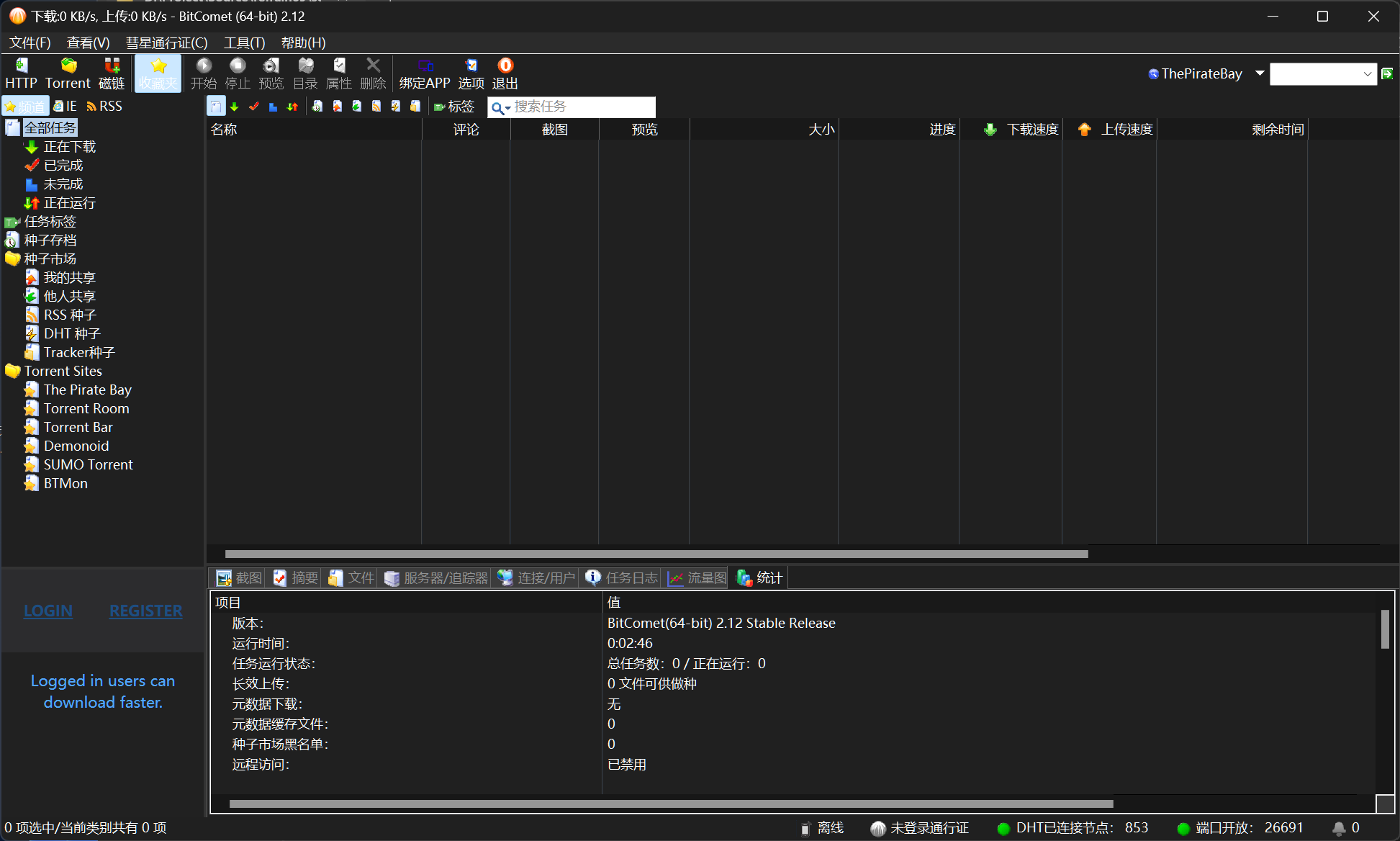 打开 BitComet,即可看到语言变成英文,种子市场等功能已经解锁。当然,如果你把语言修改为简体中文,这些功能又隐藏了。